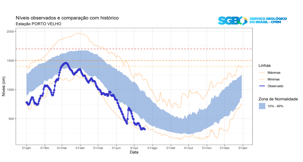 Ao longo da última semana, todos os pontos de monitoramento do Rio Madeira apresentaram redução de nível. Conforme o boletim do SGB, todas as estações estão com cotas abaixo da faixa de normalidade para este período do ano. Na estação de referência, Porto Velho, somente nos últimos 7 dias o rio teve uma redução de 32 cm.