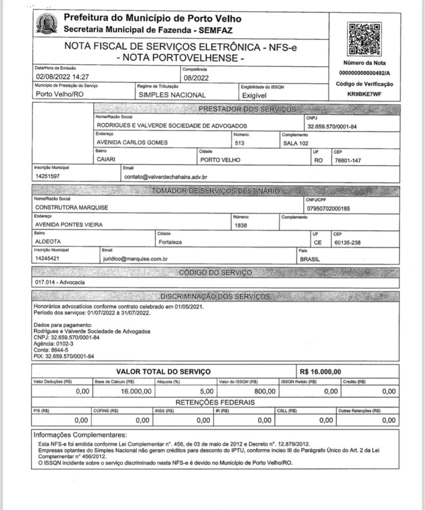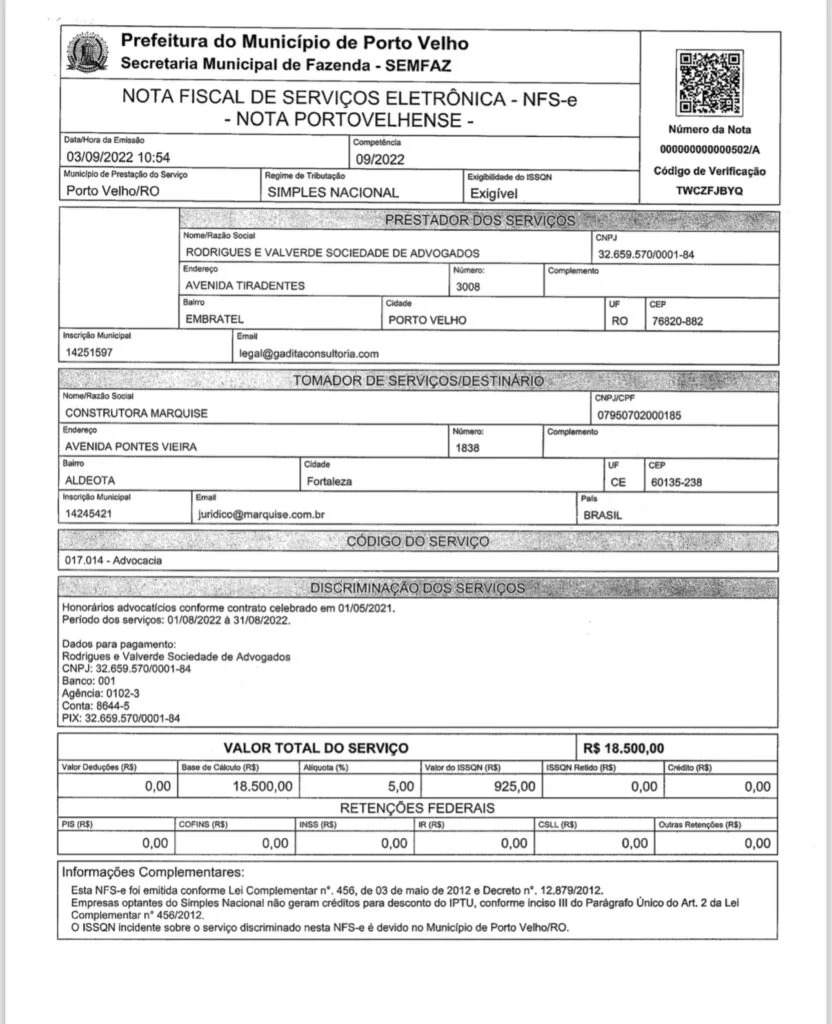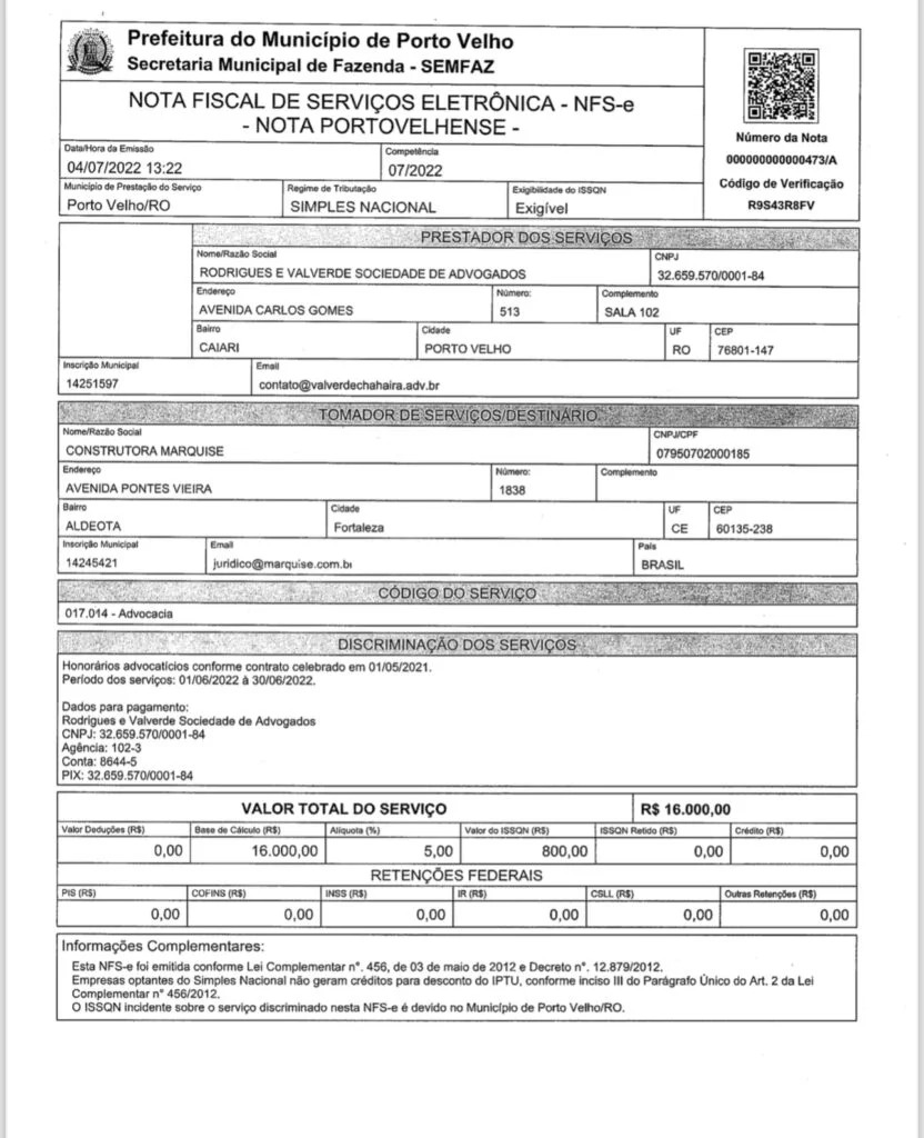 Documentos recebidos comprovam advogado Bruno Valverde, que advoga para o prefeito, Hildon Chaves, também prestou serviços para a empresa envolvida no contrato, a Marquise.