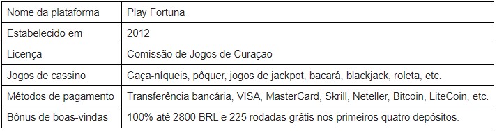 A plataforma Play Fortuna tem uma grande variedade de jogos de cassino disponíveis para os apostadores do Brasil garantirem seus ganhos. Esse cassino on-line tem mais de uma década de experiência no setor e é licenciado pela Curaçao Gaming Commission. Observando a popularidade do Play Fortuna playfortuna1.com.br, vários usuários estão ansiosos para começar sua jornada no cassino e reivindicar seus ganhos. Neste guia, os novos usuários podem ver em detalhes o processo de registro e verificação de conta, por meio do qual podem começar a apostar nessa plataforma. Aqueles que criarem uma nova conta nessa plataforma poderão receber 100% até 2800 BRL e 225 rodadas grátis em seus primeiros quatro depósitos.