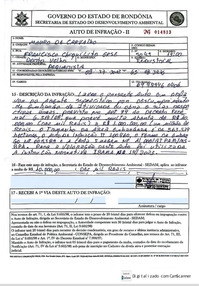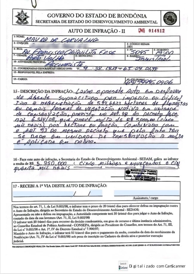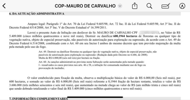 A Polícia Militar registrou boletim de ocorrência policial contra o ex-deputado Maurão de Carvalho, acusado de atear fogo em quase 2 mil hectares de uma fazenda. A área corresponde a 20 milhões de metros quadrados, ou 166 mil campos de futebol. Foram lavrados diversos autos de infração, sendo que só um deles corresponde a uma multa de quase R$ 6 milhões.