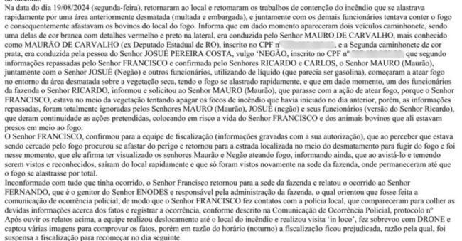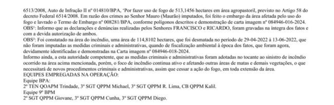Na fazenda, os policiais encontraram um funcionário. Ele confirmou que a propriedade pertence ao ex-deputado Maurão de Carvalho. O funcionário disse que ateou fogo, mas somente em uma manobra corta-fogo, para evitar que o incêndio avançasse. A PM lavrou boletim de ocorrência com diversas acusações, citando várias leis ambientais.