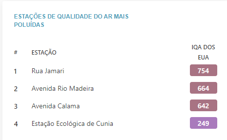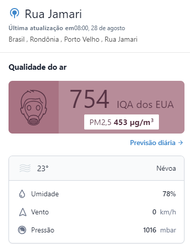 A concentração de PM2,5 em Porto Velho é atualmente 80,5 vezes maior que o valor anual recomendado pela OMS para a qualidade do ar