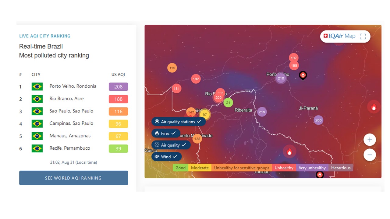 Pelo monitorado instantâneo via satélite do IQAir, Porto Velho continua liderando como a cidade mais poluída do Brasil, com o ar extremamente impróprio para a saúde humana, com índices muito acima do que é tolerado.