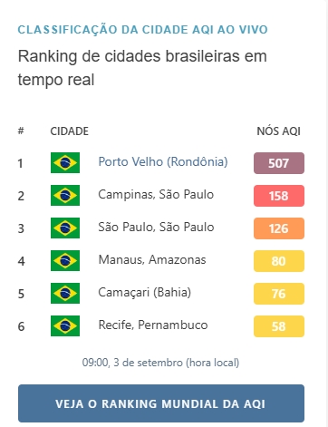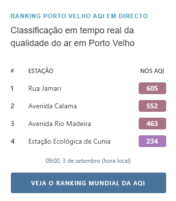 Nesta terça-feira (03), Porto Velho volta a ser destaque na plataforma que monitora a qualidade do ar no mundo, a IQAir. A espessa camada de fumaça continua a pairar sobre a cidade, com índices alarmantes que chegaram a 605 na Rua Jamari, onde estão localizados órgãos importantes como o Ministério Público de Rondônia e a Policlínica Ana Adelaide. Esse número é considerado perigoso de acordo com a Organização Mundial de Saúde (OMS).