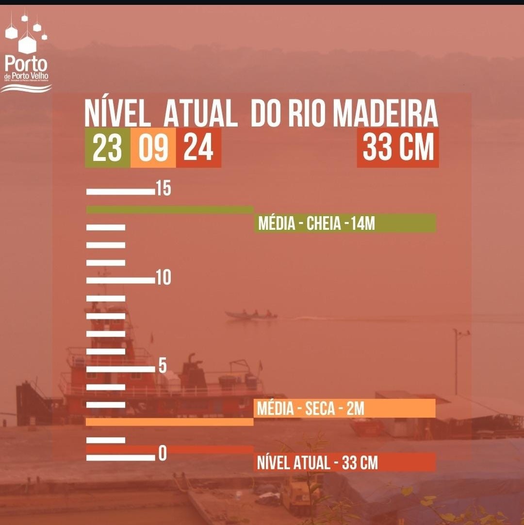 Na manhã desta segunda-feira (23), o Rio Madeira atingiu a cota mínima histórica de 33 cm, um recorde que não era observado desde 1967, quando o monitoramento do rio teve início.