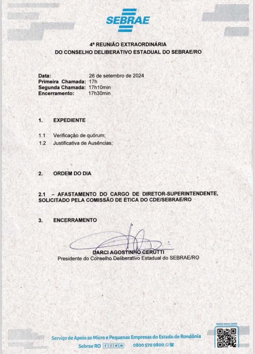 O Conselho Deliberativo Estadual (CDE) do SEBRAE/RO realizará sua 4ª Reunião Extraordinária para deliberar sobre o possível afastamento do Diretor Superintendente, Clébio Billiany de Mattos, em decorrência de graves denúncias e investigações em curso.