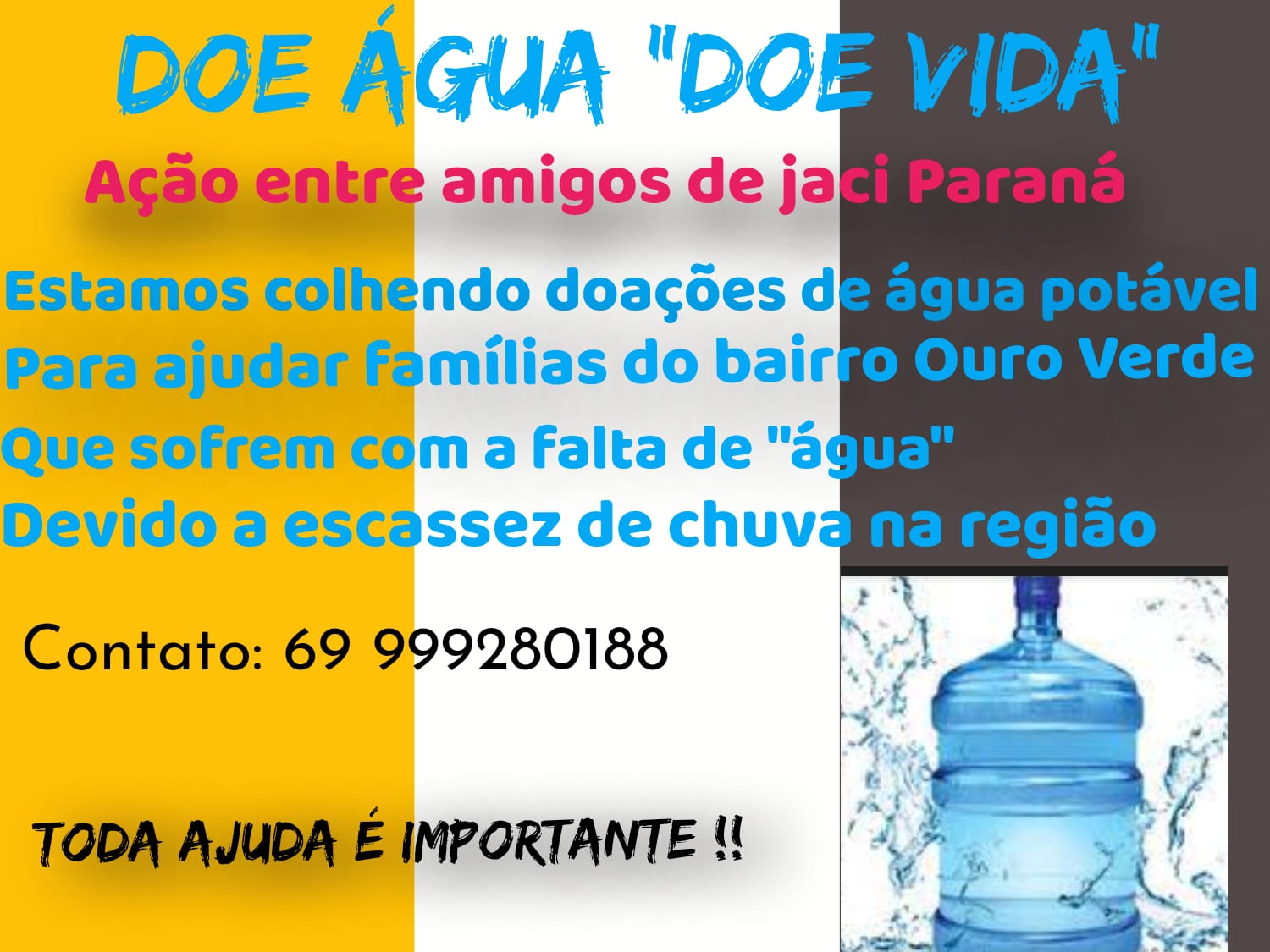 Doações de água potável podem ser feitas por interessados que entrarem em contato com Maria Francineide no número: (69) 9928-0188.