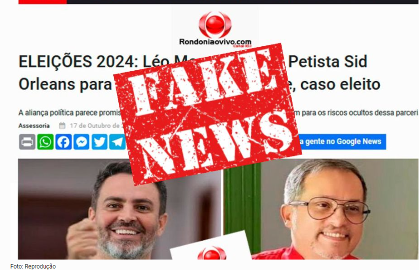 Uma fakenews grosseira feita como se fosse uma página do Rondoniaovivo se espalhou pelas redes sociais no sábado(19). O falso texto envolvia o candidato à prefeito de Porto Velho, Léo Moraes, e o ex-vereador Sid Orleans, dizendo que ele seria secretário de Saúde da capital, em caso de vitória de Léo Moraes. É lamentável o nível que se chegou nessa campanha. Por outro lado, essas pessoas desqualificadas que se prestam a esse papel estão mostrando que o desespero está tomando conta dos bastidores de alguns grupos políticos envolvidos nesse processo. O Rondoniaovivo continuará com o seu papel de bem informar os seus leitores e irá desmentir essas inverdades plantadas nas redes sociais. Internautas fiquem atentos, esse é jogo dos irresponsáveis que querem chegar ao poder, apenas para se locupletarem.