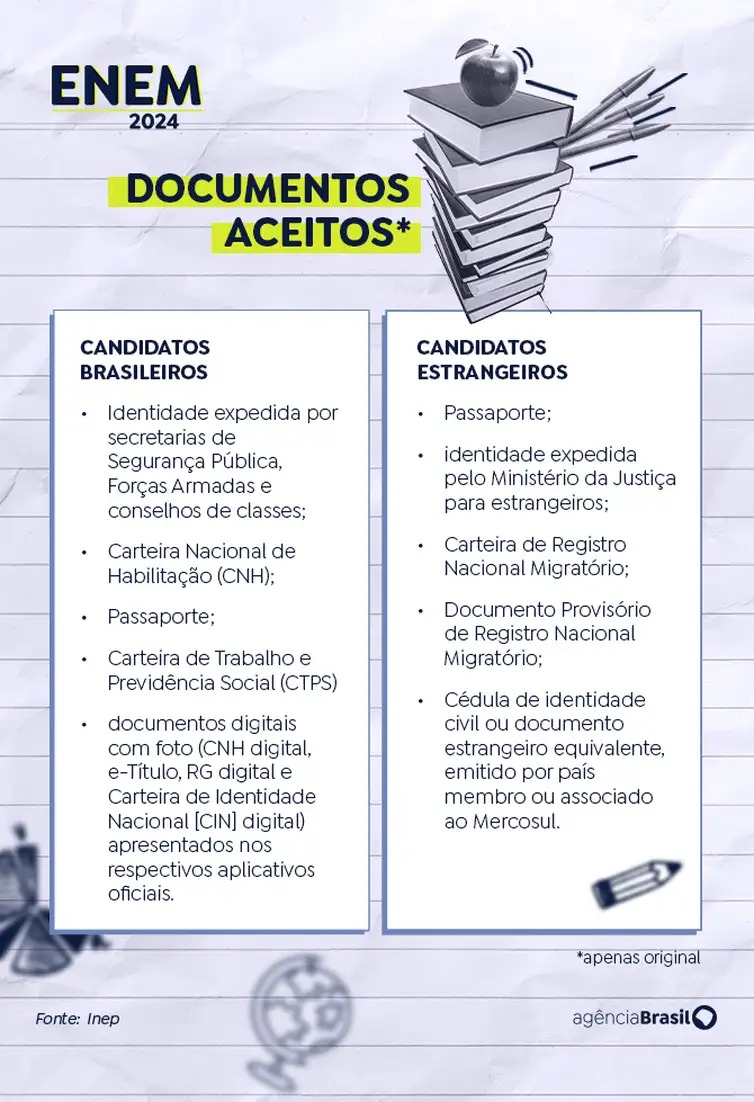 Os participantes brasileiros do Exame Nacional do Ensino Médio (Enem) de 2024 devem levar ao local das provas indicado no Cartão de Confirmação da Inscrição um documento válido com foto para identificação – impressos ou digitais, emitido por órgãos brasileiros, como a carteira de identidade, a Carteira de Trabalho e Previdência Social (CTPS). As provas do Enem 2024 serão realizadas nos dias 3 e 10 de novembro.