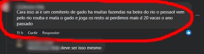 Entre as mensagens, um seguidor compartilhou sua própria experiência, afirmando que já teve mais de 20 vacas furtadas na região. “Isso aí é um cemitério de gado. Há muitas fazendas na beira do rio; o pessoal vem pelo rio, rouba, mata o gado e joga os restos aí", relatou ele.