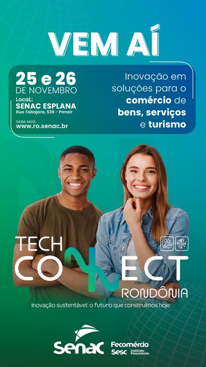 O Sistema Fecomércio/Sesc/Senac/Instituto Fecomércio-RO, por meio do Senac e parceiros, realizará nos dias 25 a 26 de novembro o TECHCONNECT RONDÔNIA - evento totalmente gratuito, que tem como objetivo fomento à cultura de inovação em Rondônia.
