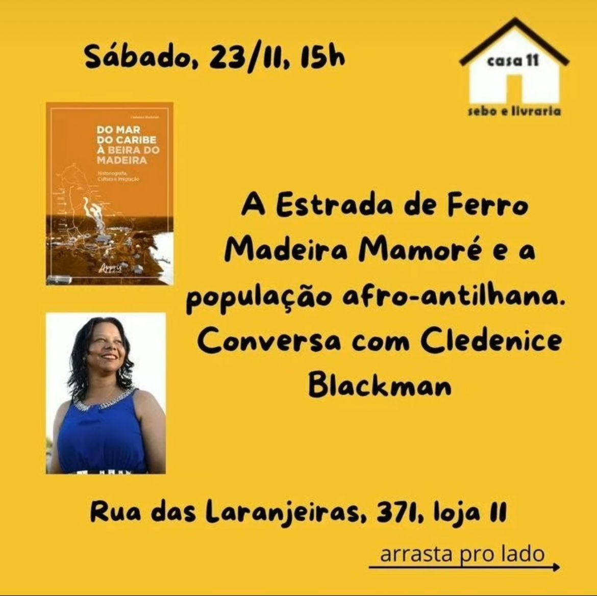 A escritora rondoniense Cleide Blackman está lançando neste sábado (23), no Espaço Cultural Casa Onze, no Rio de Janeiro, os seus livros que tratam da imigração de negros caribenhos para a construção da Estrada de Ferro Madeira-Mamoré. Na ocasião, ela irá fazer uma palestra sobre o tema. O convite para ir ao Rio de Janeiro para falar sobre a história de Rondônia, partiu do escritor Zola Xavier e da esposa dele, Janete Valadão. Parabéns!