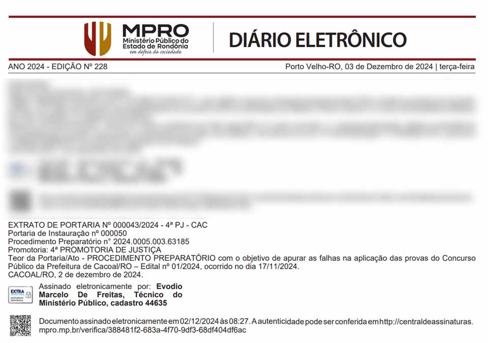 A 4ª Promotoria de Justiça, localizada no município de Cacoal, Rondônia, instaurou um procedimento preparatório para investigar possíveis falhas na aplicação das provas do Concurso Público da Prefeitura de Cacoal, regido pelo Edital nº 01/2024. O concurso foi realizado em 17 de novembro de 2024.
