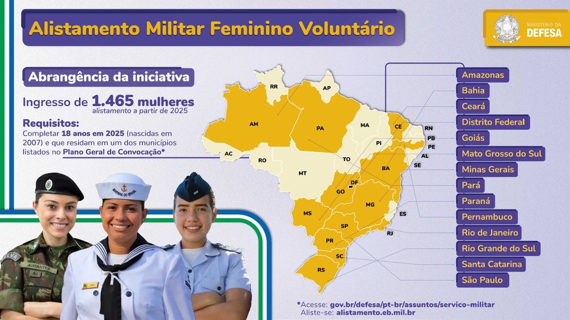 “As candidatas poderão se alistar de forma online ou presencial em uma Junta de Serviço Militar. São critérios para o alistamento possuir residência em um dos municípios contemplados no Plano Geral de Convocação e completar 18 anos em 2025 (nascidas em 2007). Entre os documentos solicitados estão a certidão de nascimento ou prova de naturalização; comprovante de residência e documento oficial com foto”, informou o Ministério da Defesa.