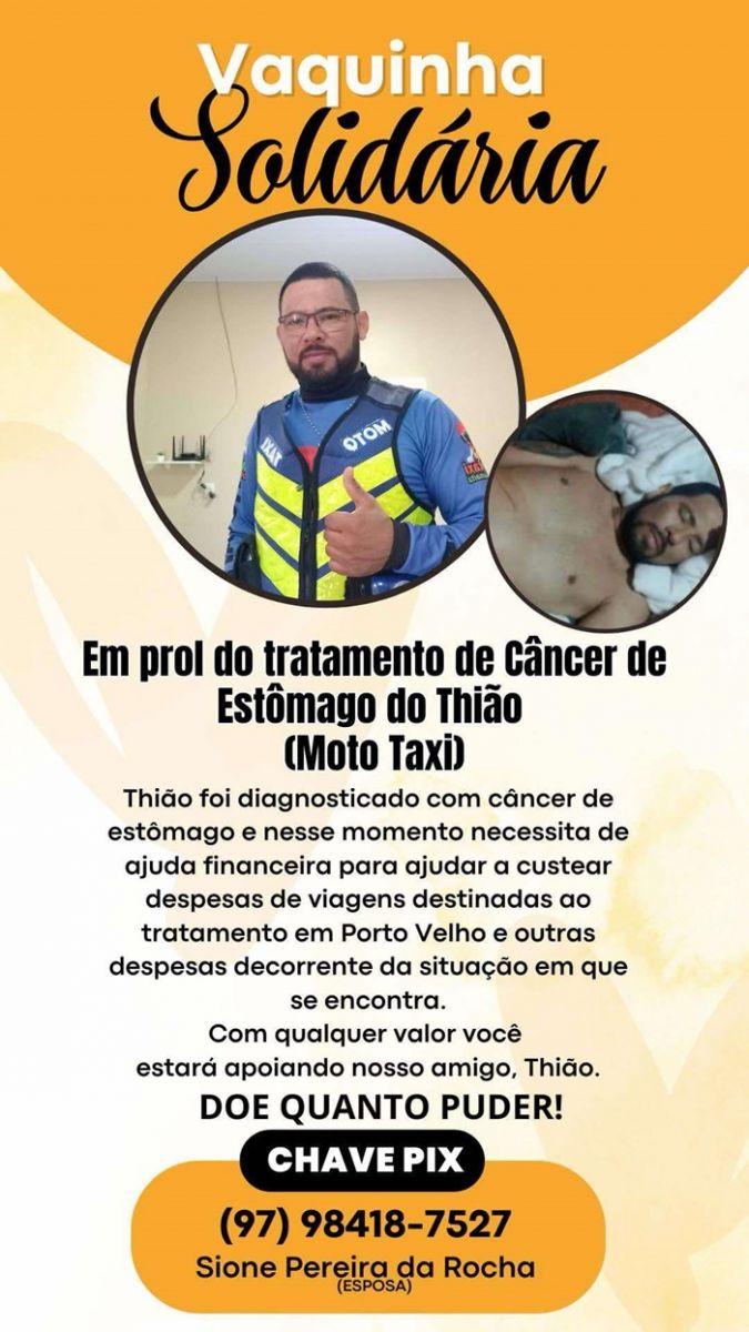A família do moto taxi Sebastião Rodrigues de Sousa, conhecido como Tião, de Humaitá, AM, lançou uma vaquinha online para angariar recursos para ajudar no tratamento de câncer no estômago que realiza em Porto Velho, RO.