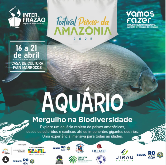 O 2º Festival de Peixes da Amazônia acontece de 16 a 21 de abril, na Casa de Cultura Ivan Marrocos, em Porto Velho. O evento será um marco para o setor pesqueiro rondoniense. Rondônia tem se destacado na cena nacional como um grande produtor de pescado e tem se profissionalizado cada vez mais. O festival é uma iniciativa do Instituto Vamos Fazer e da INTERFRAZÃO, e contribui para se consolidar como uma ação de referência para o desenvolvimento e a inovação no setor pesqueiro da Amazônia. Imperdível!