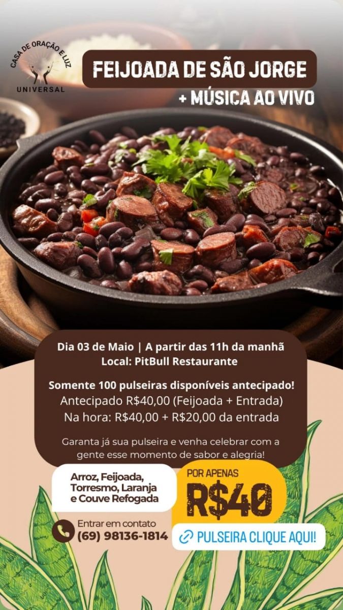No próximo dia 3 de maio, a partir das 11h, o Pitbull Restaurante, em Porto Velho, será palco da tradicional Feijoada de São Jorge, promovida pela Casa de Oração e Luz Universal. O evento contará com música ao vivo para animar o público em uma tarde de celebração, sabor e alegria.