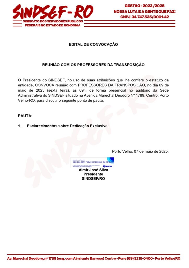 O Sindsef convoca os professores para reunião exclusivamente para tratar da pauta sobre Dedicação Exclusiva, nesta sexta-feira, dia 8 de maio, às 9h, no auditório da Sede Administrativa, localizada na Rua Marechal Deodoro, 1789 – Centro.