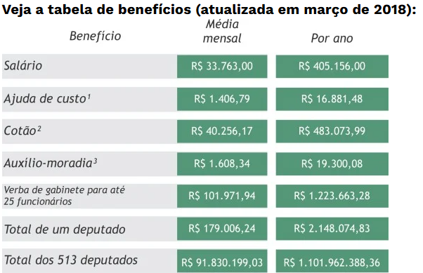 Porém, sempre tem um, porém, esse mesmo parlamento que cobra austeridade e aperto nos gastos do Governo Federal, apresentou um projeto de lei que extingue a proibição do acúmulo de aposentadoria como parlamentar com o salário de cargo eletivo federal. A matéria, protocolada na terça-feira (10), é assinada pelo presidente da Câmara, deputado Hugo Motta (Republicanos-PB) e pelos representantes do PL, PP, União Brasil, PT e PSD na Mesa Diretora. A Lei 9.506, de 1997, que criou o atual regime de previdência dos deputados e senadores, diz que o parlamentar federal que tiver direito ao benefício da aposentadoria não poderá receber o pagamento enquanto estiver no mandato de deputado, senador ou outro cargo eletivo. Caso o projeto seja aprovado, ele permitirá que deputados e senadores - participantes do Plano de Seguridade Social dos Congressistas (PSSC) - acumulem a aposentadoria, que é proporcional com o tempo de contribuição, com o salário de R$ 46.366,19, pago atualmente. Além disso, ainda tem a “gratificação natalina” para os integrantes do PSSC a ser paga com base nos valores recebidos pelos parlamentares em dezembro. Veja na tabela o quanto ganhava um deputado federal em 2018.