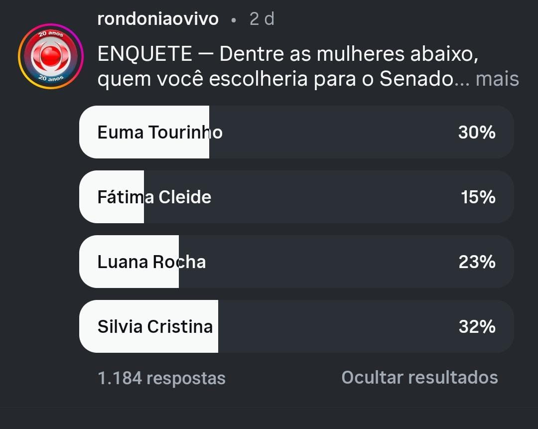 Rondoniaovivo e 1.184 pessoas responderam. Uma informação interessante, na postagem da rede social também houveram 327 comentários e 44 compartilhamentos. Depois de dois dias no ar e com alcance de 37.316 internautas na enquete, Silvia Cristina ficou em primeiro lugar, em disputa acirrada com Euma Tourinho - que nunca foi cotada para o Senado.