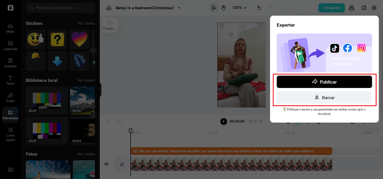 Veja os Avatares Recomendados, filtrando por estilo, idade ou setor. Clique em Editar Roteiro para escrever suas falas ou letras em vários idiomas, depois altere o estilo das legendas para adicionar subtítulos profissionais que combinem com a estética do vídeo.