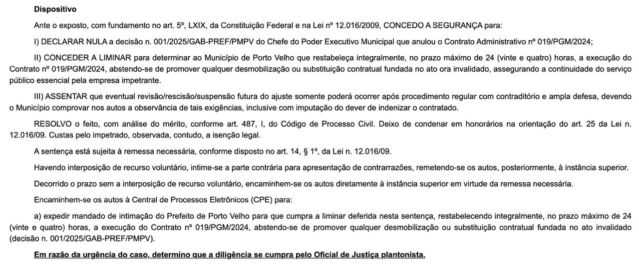 Uma decisão da Justiça determinou o restabelecimento do contrato entre o Município de Porto Velho e a empresa Ecorondonia Ambiental S/A, responsável por serviços na área ambiental. A medida foi tomada pelo juiz Edenir Sebastião Albuquerque da Rosa, que entendeu que a rescisão contratual feita pela Prefeitura foi irregular.