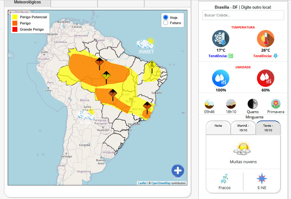 O aviso, que entrou em vigor às 17h14 desta terça, segue válido até as 9h da manhã de quarta-feira. De acordo com o INMET, o alerta laranja indica risco potencial de alagamentos, descargas elétricas e rajadas de vento.
