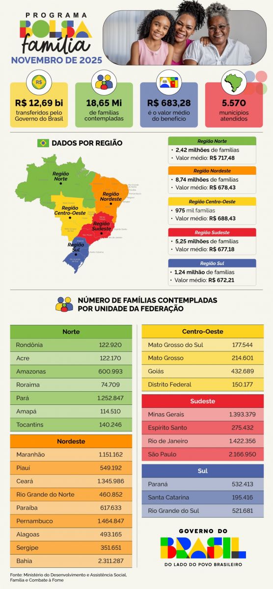 NACIONAL — O programa de transferência de renda do Governo do Brasil contempla neste mês 18,65 milhões de famílias (48,59 milhões de pessoas). O valor médio de repasse é de R$ 683,28, a partir de um investimento de R$ 12,69 bilhões.