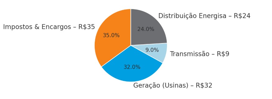 A Energisa detalha que, em uma conta de R$100, a divisão é a seguinte: