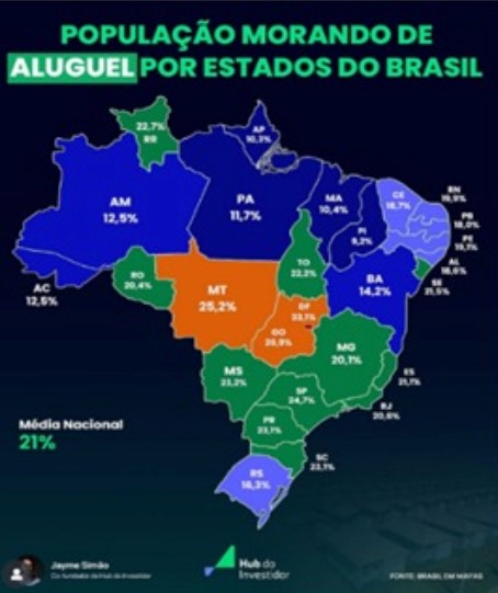 A média nacional de moradores que pagam aluguel é de 21%, mas em estados como o Distrito Federal (33,1%) e Goiás (26,9%) os índices são ainda mais altos.
