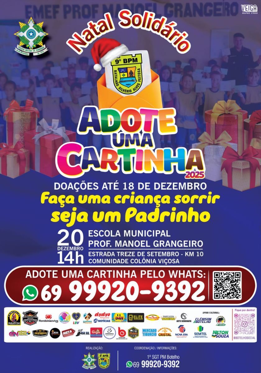 O 9º Batalhão da Polícia Militar de Rondônia está realizando mais uma edição do Projeto Adote Uma Cartinha, uma das ações solidárias mais marcantes da zona Sul de Porto Velho. A iniciativa tem como objetivo atender pedidos de Natal escritos por crianças em situação de vulnerabilidade, garantindo que cada uma delas receba um presente e viva um momento especial neste fim de ano.