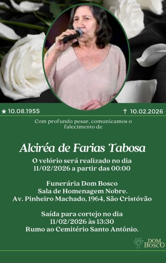 Com profunda tristeza, mas com o coração repleto de gratidão pela vida compartilhada, comunicamos o falecimento de Alciréa de Farias Tabosa, ocorrido nesta terça-feira, em Porto Velho.