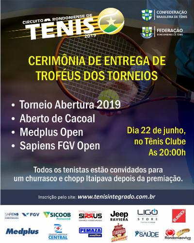 Á partir das 20:00 horas, está programado a realização da Cerimônia de Entrega de Troféus para premiar os campeões e vice-campeões dos 04 torneios que foram realizados no 1º semestre de 2019, são eles: Torneio de Abertura 2019, Aberto de Cacoal, Medplus Open, Sapiens FGV Open BR 364 RO1000.