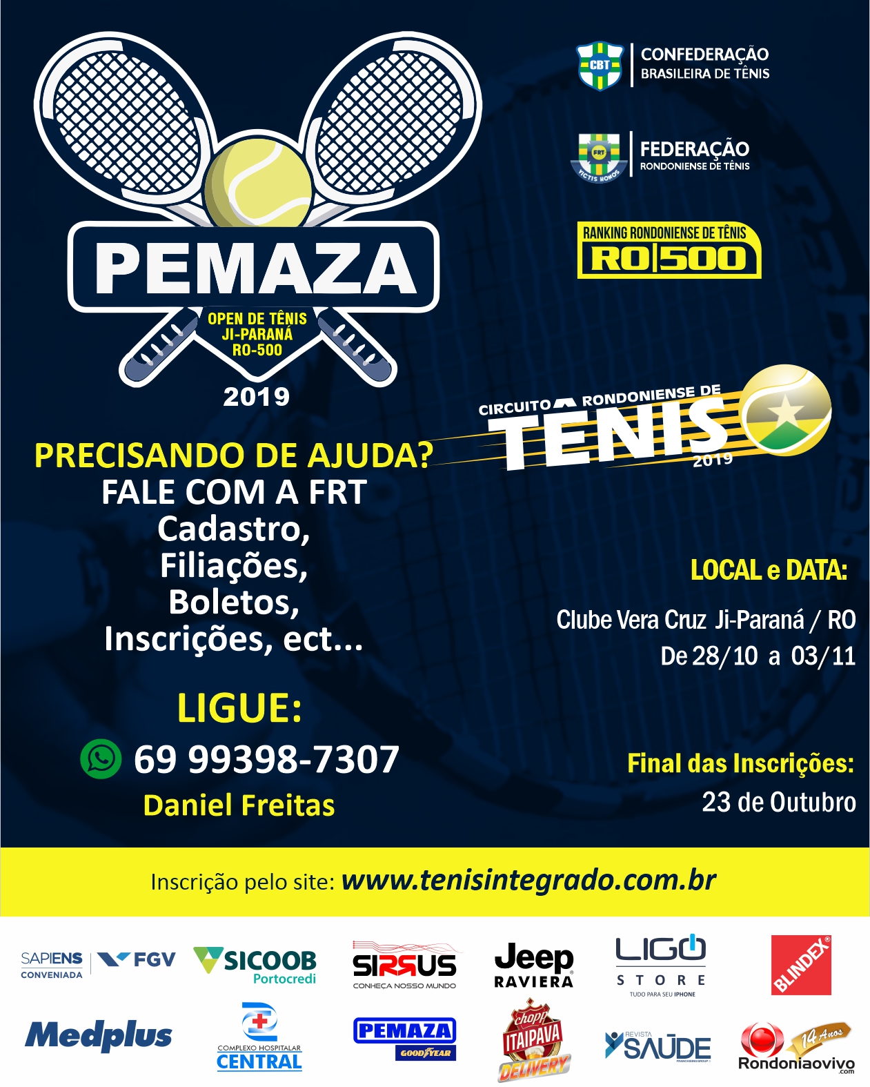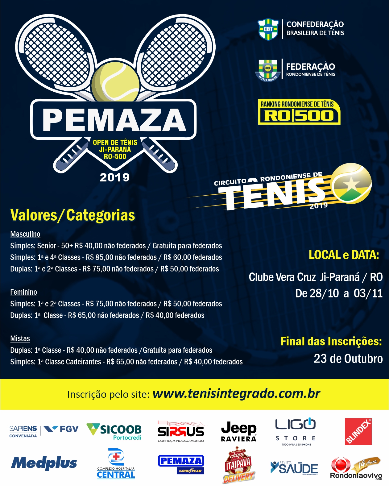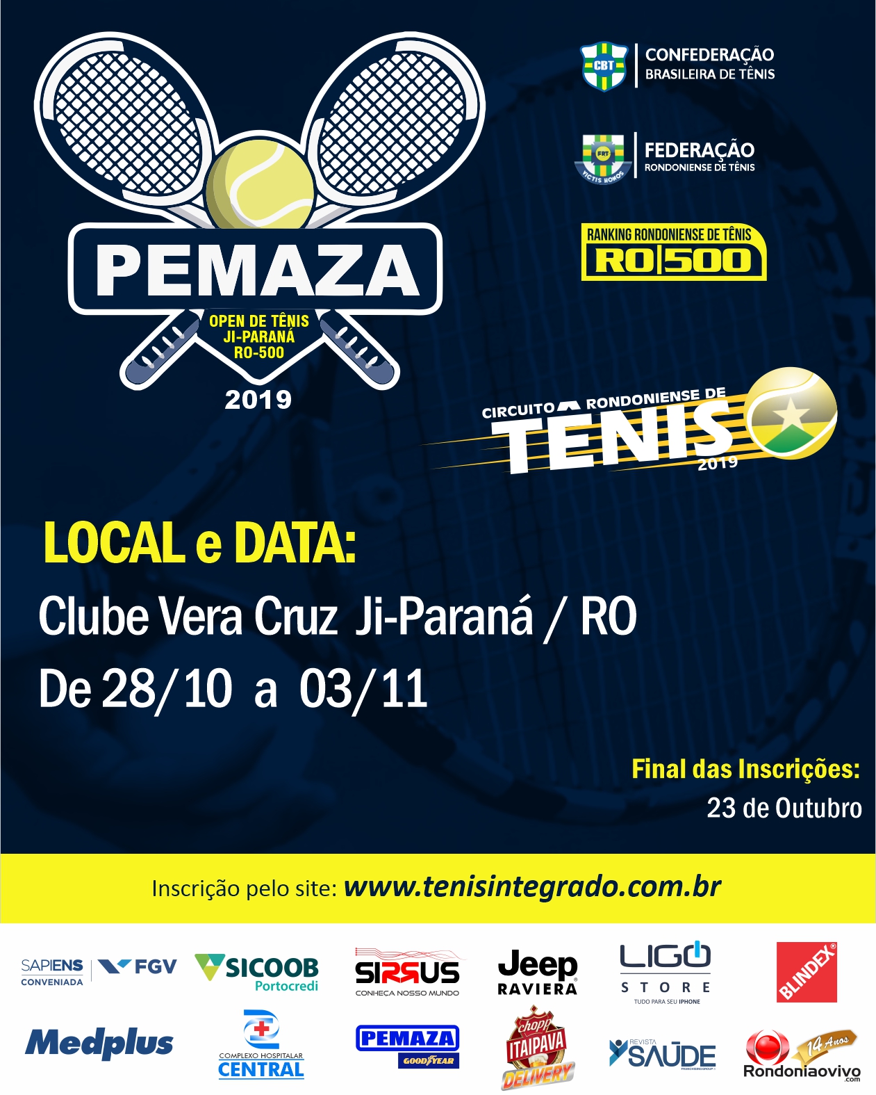 Foram abertas as inscrições para o Pemaza Open de Tênis RO 500, que será realizado entre os dias 28 de outubro a 03 de novembro em Ji-Paraná/RO, no Clube Vera Cruz. Para participar basta efetuar sua inscrição no site www.tenisintegrado.com.br até às 23:59 horas do dia 23 de outubro.