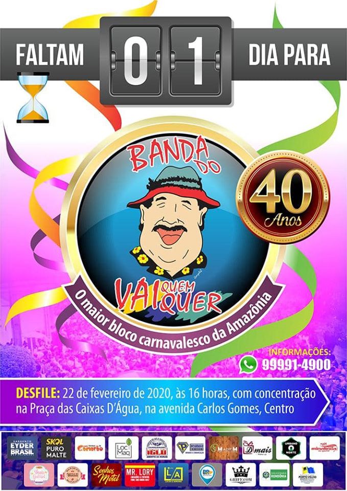 O Carnaval 2020 está chegando e com ele o desfile do maior bloco de carnaval de rua da região Norte: A Banda do Vai Quem Quer, que este ano completa 40 anos de desfile pelas principais ruas de Porto Velho. O desfile será no dia 22 de fevereiro, sábado oficial de carnaval, com concentração na Praça das Três Caixas D’Água e saída prevista para as 16h.