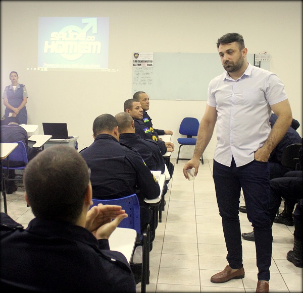 O Dr. Laerte, tendo como foco as atividades desenvolvidas na Campanha Novembro Azul, explanou aos Policiais Militares alunos a Sargento sobre temas importantes a respeito de doenças que mais acometem os homens, além de ter respondido a diversas perguntas a respeito de hábitos para se ter uma vida mais saudável e de qualidade.