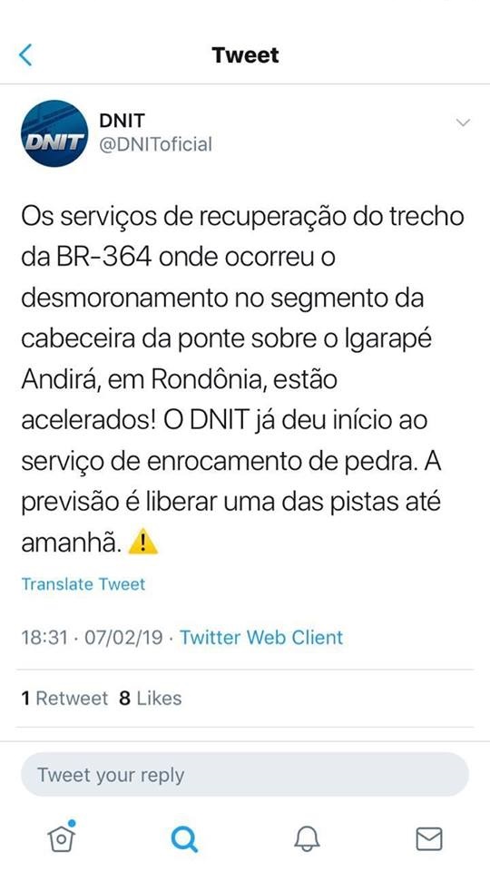 O Dnit informa via redes sociais que amanhã poderá liberar meia pista. Pelo fato da chuva ter dado uma cessada, o trabalho foi agilizado pela equipe do DNIT com a retirada da parte que cedeu.