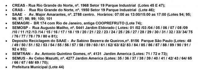 Os lotes estarão em exibição para serem analisados pelos possíveis compradores a partir do dia 15 deste mês nos seguintes pontos: Creas (Centro de Referência Especializado em Assistência Social), Cras (Centro de Referência em Assistência Social), Saae (Serviço Autônomo de Água e Esgoto), Semagri (Secretaria Municipal de Agricultura), Semosp (Secretaria Municipal de Obras e Serviços Públicos), Depósito de