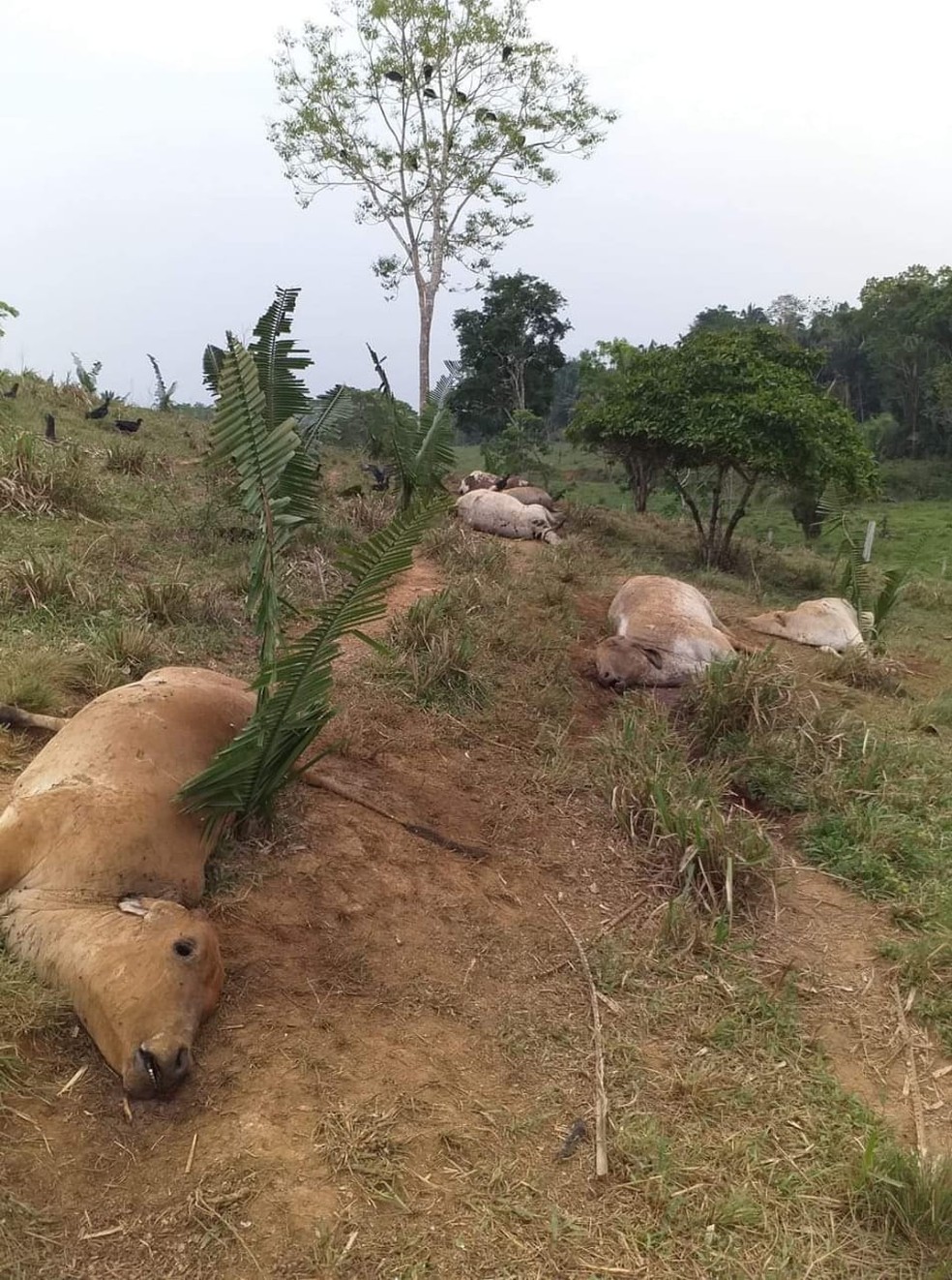 Dez vacas morreram durante uma tempestade de raios em um sítio da Linha 610 no distrito de Bom Jesus, no município de Jaru. Os corpos dos animais foram localizados no meio da pastagem, no fim da tarde de terça-feira (3), pelo dono da propriedade.