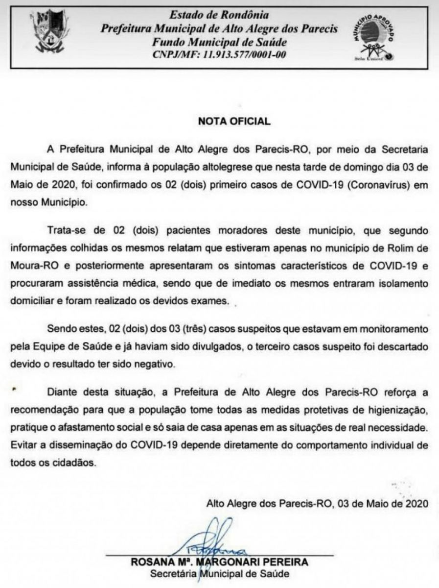 Os pacientes estiveram apenas em Rolim de Moura, ao retornarem apresentaram sintomas característico de Covid-19 e entraram em isolamento social