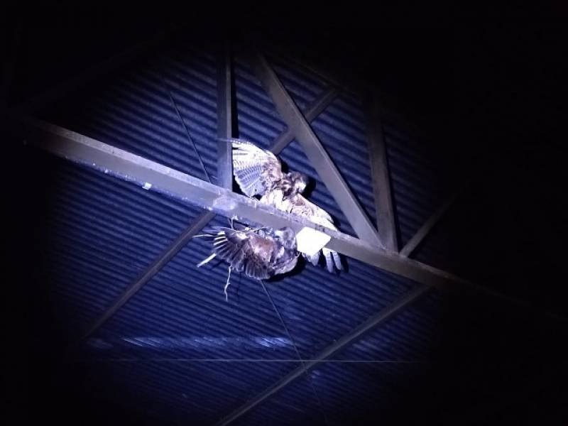 Thiago explica que agora, com duas aves, um casal, o trabalho pode ser desenvolvido com mais rapidez. Antes disso, porém, as aves de rapina passam por treinamento antes de entrarem em ação. A preparação envolve ensinar ao animal atacar alvos iluminados por lanternas dos instrutores, retornar à mão e também capturar as presas com velocidade.