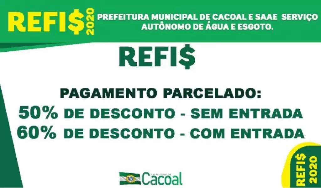 Já está disponível na Divisão de Receita da Prefeitura para pagamento, o IPTU  com 20% para quem pagar até 30 de junho, 15% até 31 de julho e 10% até 31 de agosto de 2020. Para os que estão em débito e querem negociar suas dividas,  a Prefeitura oferece por meio do REFIS, a opção de 50% de desconto para pagamento sem entrada e de 60% de desconto  para o pagamento com entrada.
