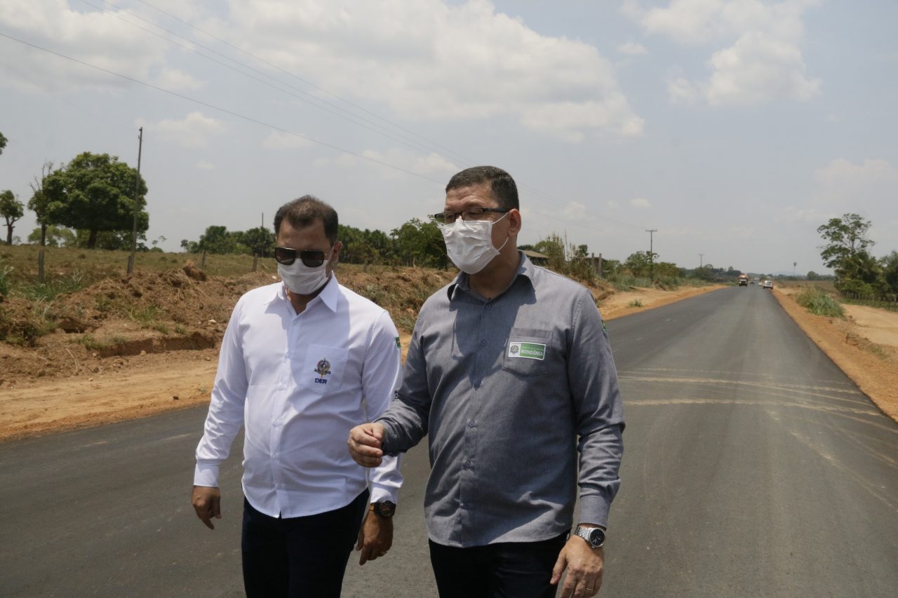 Acompanhado do diretor do DER, Elias Rezende, o governador de Rondônia, coronel Marcos Rocha vistoriou o início da pavimentação da RO-470
