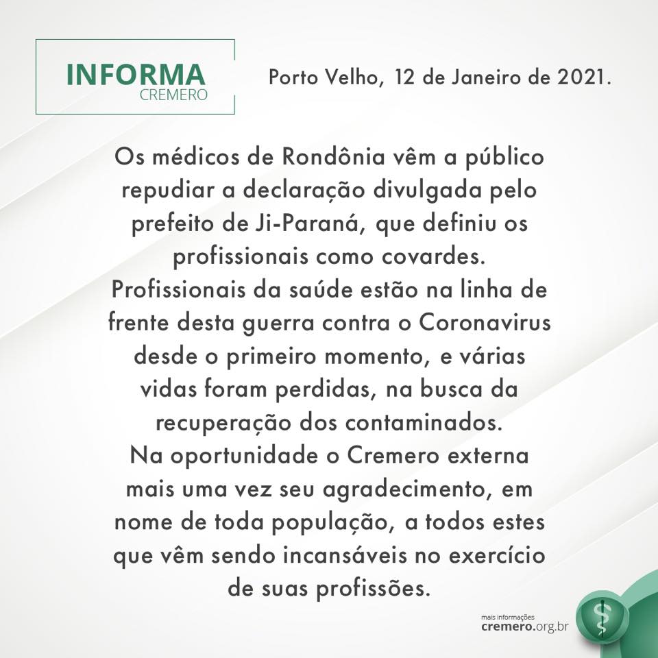 Após a declaração de Fonseca, o Cremero se posicionou e repudiou as declarações do chefe do poder executivo. “Os médicos de Rondônia vêm a público repudiar a declaração divulgada pelo prefeito de Ji-Paraná”, diz um trecho da nota.