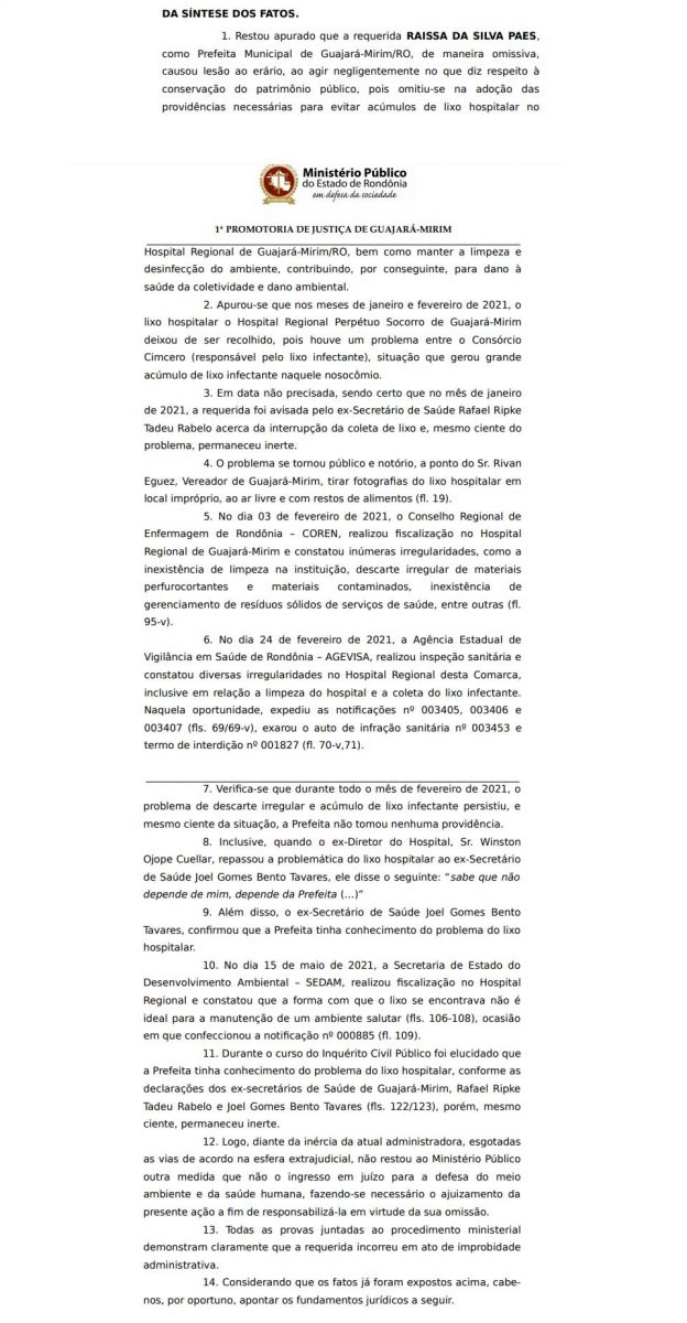 “Por não realizar nenhum tipo de fiscalização preventiva no local, omitir-se na adoção das providências necessárias para evitar novos acúmulos de lixo hospitalar no Hospital Regional de Guajará-Mirim, bem como limpeza e desinfecção do ambiente, a requerida deixou de praticar, indevidamente, ato de ofício”, diz trecho da peça inicial encabeçada pelo MP/RO.