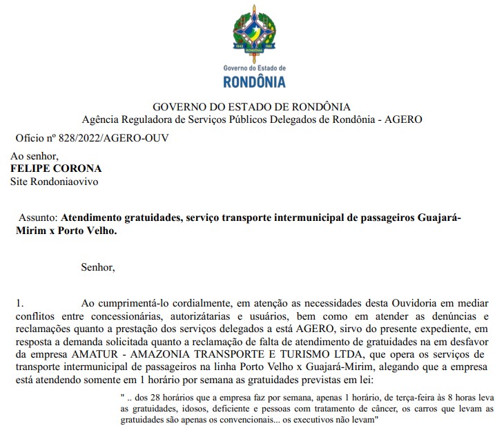 “Esta ouvidoria notificou a empresa para apresentar esclarecimentos quanto aos fatos narrados. A mesma apresentou resposta relatando e comprovando que apesar da obrigatoriedade legislativa de atendimento das gratuidades de idosos e deficientes e seus descontos tarifários, serem tão somente em horários convencionais, a empresa vêm atendendo as citadas gratuidades, diariamente e ainda em todos os horários do serviço de transporte intermunicipal de passageiros na linha Porto Velho x Guajará-Mirim, independentemente do tipo de serviço que está sendo executado, quer seja ele convencional ou executivo. Apresentando ainda planilha, que consta dados de atendimento referente as gratuidades no período de 01/08 à 31/08/2002”, destaca um trecho do documento assinado pela diretora-presidente do órgão, Silvia Lucas da Silva Dias.