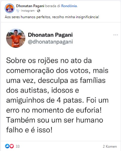 “Aos seres humanos perfeitos, recolho minha insignificância!”, seguido do texto, “sobre os rojões no ato da comemoração dos votos, mais uma vez, desculpas as famílias dos autistas, idosos e amiguinhos de 4 patas. Foi um erro no momento de euforia! Também sou ser humano falho e é isso!”.