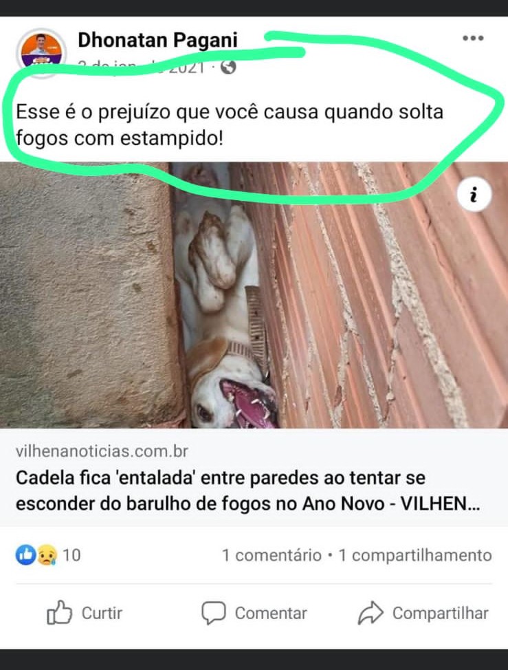 “Esse é o prejuízo que você causa quando você solta fogos com estampido”, acompanhado de uma reportagem com a seguinte manchete: “Cadela fica ‘entalada’ entre paredes ao tentar se esconder do barulho de fogos no Ano Novo”.