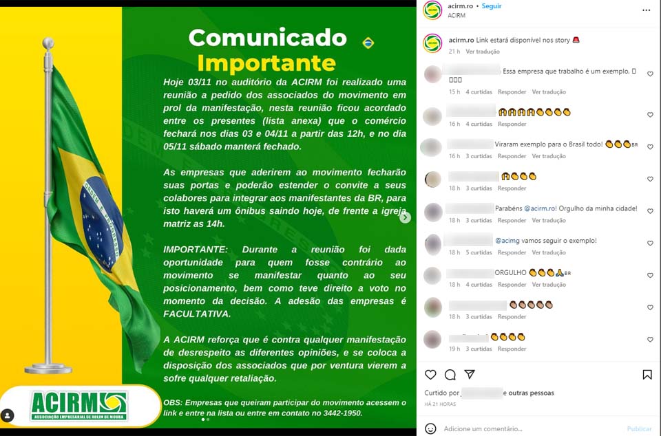 Apesar da decisão judicial federal vigente determinando a desobstrução das rodovias em Rondônia, a Associação Empresarial de Rolim de Moura (ACIRM) anunciou a paralisação do comércio na cidade nos dias 03 (ontem), 04 e 05 de novembro.