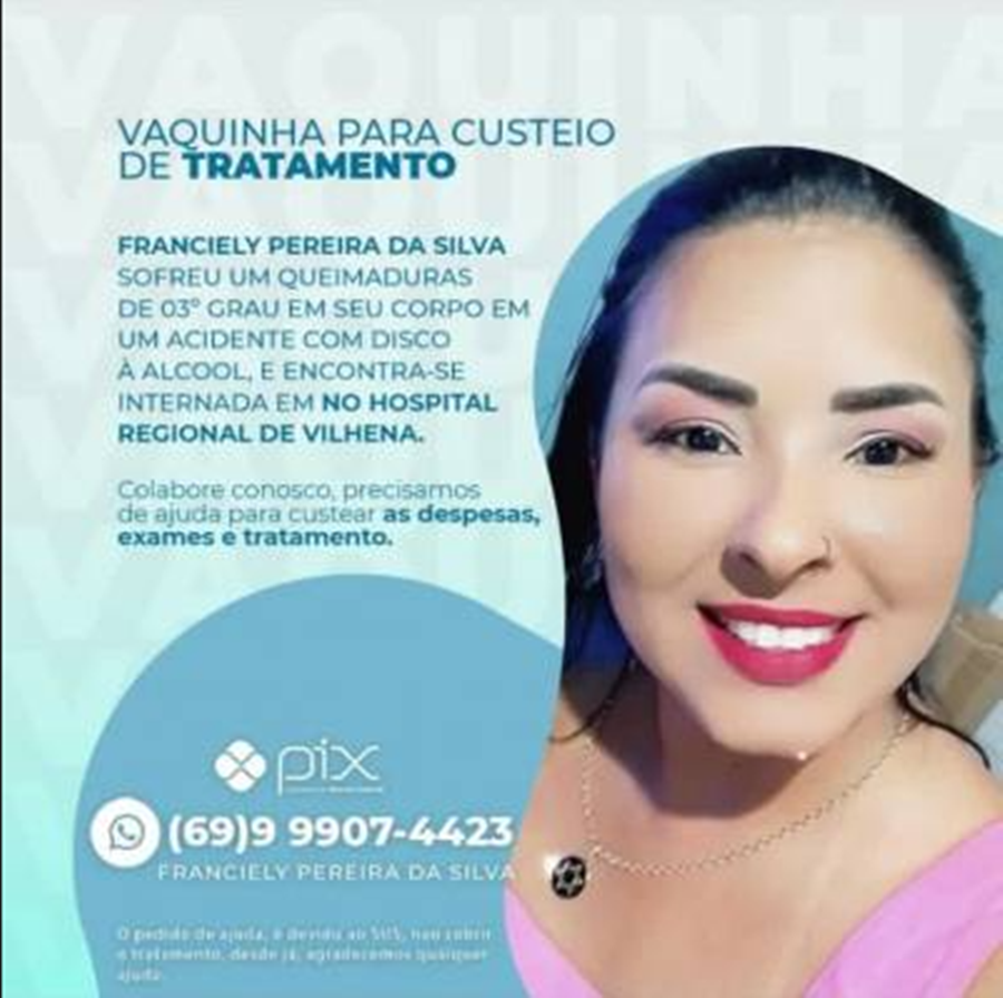 Através das redes sociais e do WhatsApp, amigos da auxiliar de dentista Franciely Pereira da Silva, de 31 anos (FOTO), deflagraram uma campanha para ajuda-la a comprar produtos específicos para as queimaduras que ela sofreu no dia 23 de dezembro do ano passado, em Vilhena.